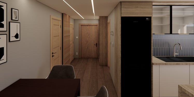 We created an interior design project for a future resident of a housing estate in Dublin, focusing on maximizing functionality while complying with all safety regulations and standards. Due to structural restrictions, wall modifications were not possible, so we optimized the layout and aesthetic arrangement to make the most of the available space.